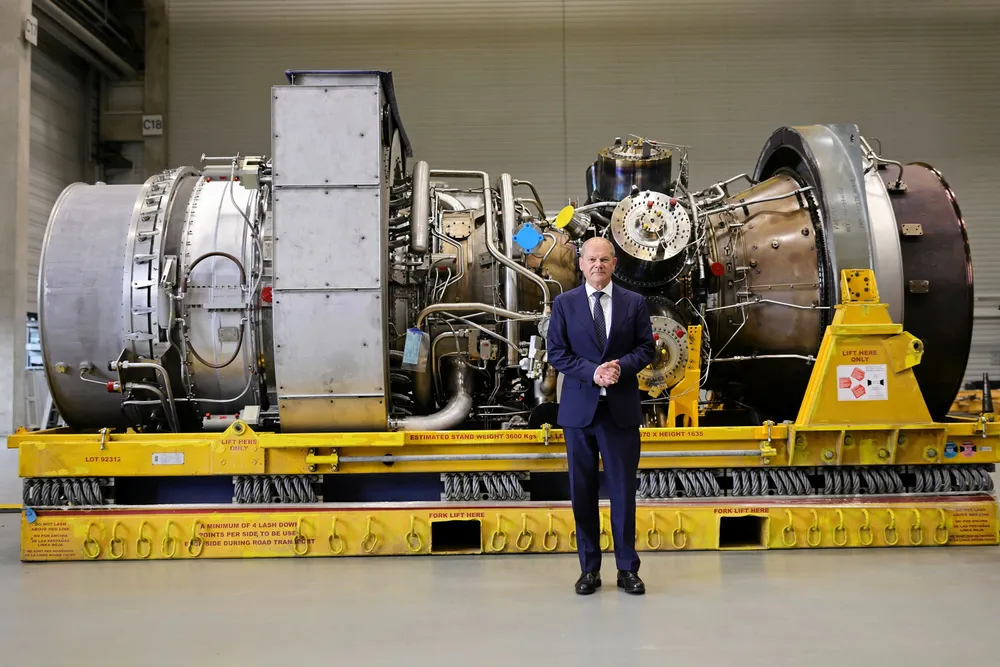 German Chancellor Olaf Scholz in front of a Siemens Energy gas turbine needed for the Nord Stream 1 pipeline