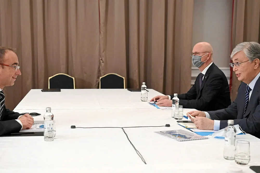Kazakh president Kassym-Jomart Tokayev (r), deputy prime minister Roman Sklyar (center right) and Svevind CEO Wolfgang Kropp (l) at meeting on November 26th
