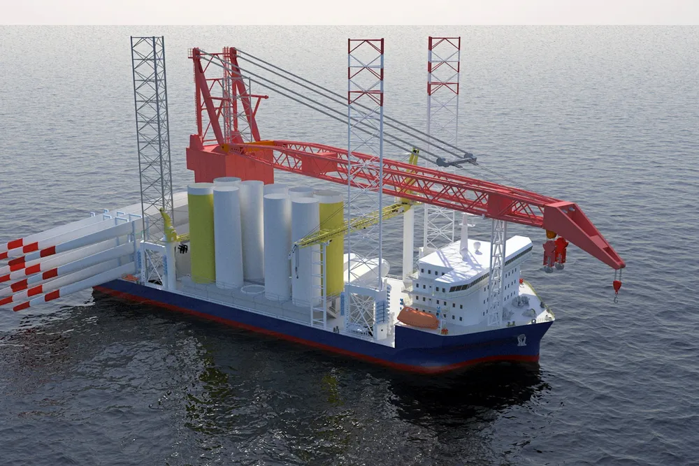 Though of a size capable of handling turbines even larger than the 15MW class machines now in development around the world, the 3060 is foreseen transporting smaller models, with its deck-load able to accommodate for four 12MW nacelles and towers or eight sets of 8MW units, with installation using its 2,200-tonne crane.