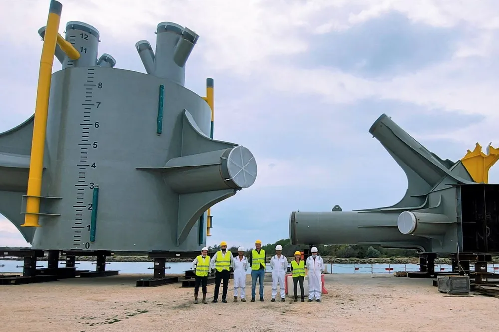 The three floaters for PGL, being assembled in Port Saint-Louis on the Mediterranean Sea, are slated to be installed in 100 metres of water some 14km offshore “later this year” as part of the first project in the world to employ so-called TLPs.