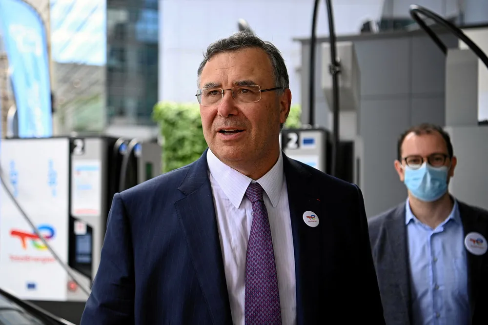 Total Chief Executive Officer Patrick Pouyanne looks on during the unveling ceremony of the new TotalEnergies logo, at La Defense on the outskirts of Paris on May 28, 2021. - Total shareholders voted on the strategy of the oil and gas giant, which renamed itself TotalEnergies to mark its diversification, while some investors are urging it to act more quickly. (Photo by Christophe ARCHAMBAULT / AFP)Foto: CHRISTOPHE ARCHAMBAULT