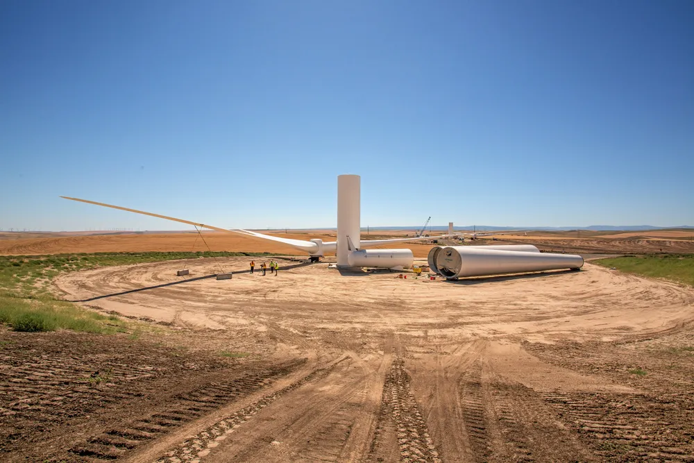 The tower and rotor are ready for assembly at the Tucannon Wind Farm during construction, July 2014. . Construction of Portland General Electric's Tucannon River wind farm in Washington state.