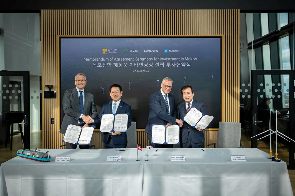 Vestas chief operating officer Tommy Nielsen attended a signing ceremony for the deal with Vincent Clerc, CEO of Maersk; Kim Yung-rok, governor of Jeollanam Province; and Park Hong-ryul, mayor of Mokpo City.